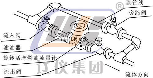 該流量計(jì)必須與濾油器配套使用而用水平安裝(即表盤在水平位置),安裝時(shí)要注意流體流向,應(yīng)符合流量計(jì)主體上的箭頭所示方向。為了使工藝設(shè)備不停止運(yùn)轉(zhuǎn)即可檢修流量計(jì)與清洗濾油器,應(yīng)裝設(shè)副管線,可參照下面的安裝示意圖。